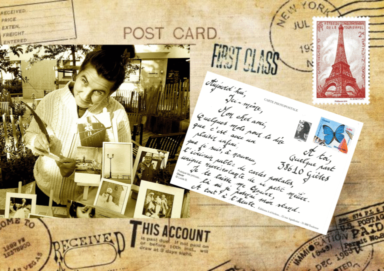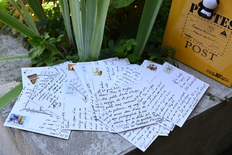 En 2026, l’écrivain public de cartes postales fête ses 20 ans et continue à mettre au goût du jour le timbre- poste, l’écriture à la plume, l’encre, et les beaux sentiments. L’histoire est née à Toulouse au marché de Saint-Aubin, et suis son chemin sur les routes de France, avec un infini plaisir. Un poésie redoutable qui s’installe parfois sur les portes des frigidaires… D’une petite table discrète, le stand est devenu un véritable écrin, tel qu’un petit bureau de poste en bois. LA TOURNÉE DE L’ÉTÉ 2025 : Renseignements et devis auprès de Lucie B.