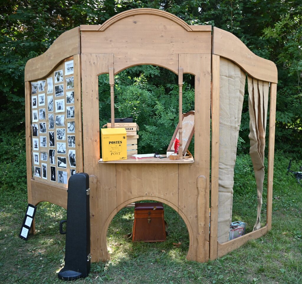 D’une petite table discrète, le stand est devenu un véritable écrin, tel qu’un petit bureau de poste en bois.