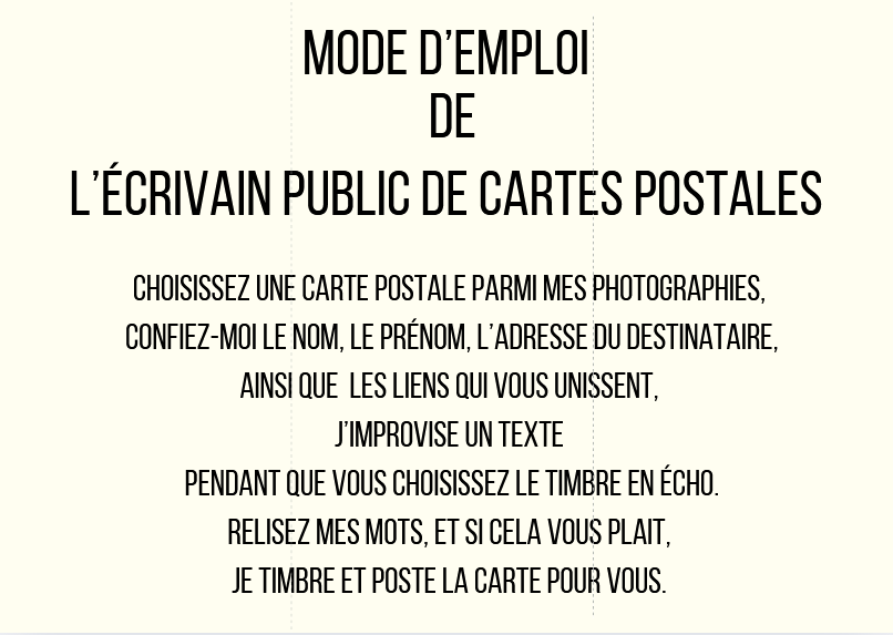 En 2026, l’écrivain public de cartes postales fête ses 20 ans et continue à mettre au goût du jour le timbre- poste, l’écriture à la plume, l’encre, et les beaux sentiments. L’histoire est née à Toulouse au marché de Saint-Aubin, et suis son chemin sur les routes de France, avec un infini plaisir. Un poésie redoutable qui s’installe parfois sur les portes des frigidaires…