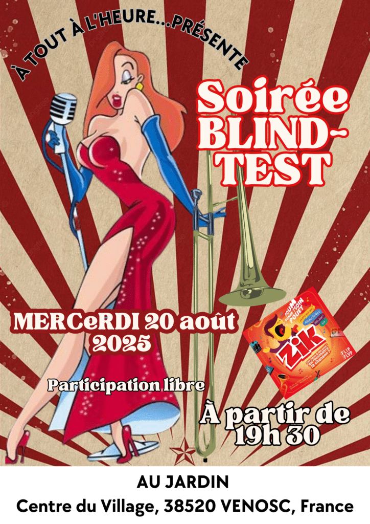 ZiK, est un blind-test participatif, accompagné au trombone, par une MLLE Loyale endiablée, et qui tente de vous faire reconnaître des tubes, que sans doute, vous connaissez ! Mais c’est à vous de fredonner les chansons grâce aux onomatopées proposées…
